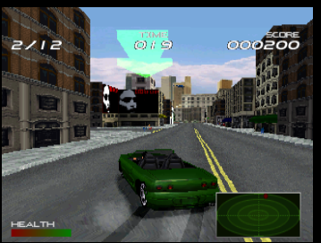 The other levels are totally different. Some are simple ‘drive fast from A to B while dodging enemies’ levels, some are ‘drive fast around the city Crazy Taxi style while picking up MacGuffins’, and then you have ‘drive fast while ramming a commercial airliner during takeoff [seriously]’ and ‘drive fast while shooting lasers at the wheels of a lorry’. The variety isn’t a bad thing, but the difficulty swings up and down harder than any other game I could name from the top of my head. The hardest level in the game is level 3. The easiest is level 4. Level 9 is easy, apart from the very last bit which is so hard as to be almost broken; there are no checkpoints either, so expect many restarts.