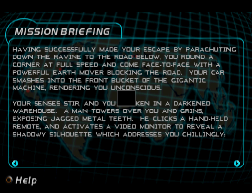 007 Racing is a game where you drive a selection of James Bond cars through twelve objective-based 3D levels. There is some sort of ‘plot’, and the levels roughly follow a narrative, but it isn’t one that you’re supposed to think very hard about, and indeed is primarily explained via nothing more than expository walls of text, which can be optionally read at the beginning of each level. I’ve already forgotten it. Suffice it to say that it’s all an excuse to let you go hog wild driving Aston Martin DB5s and using associated gadgetry to blow things up.