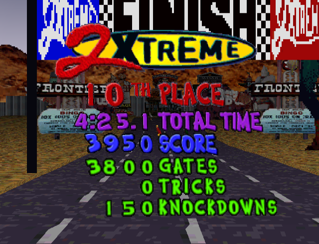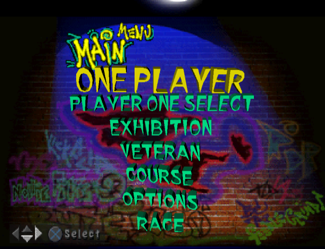 A sequel to ESPN Extreme Games (they lost the licence), everything about it has the MTV-style graffiti-filled ‘edgy 90s EXTREME’ look, from the menu layout, to the race announcer, to the concept in general - even choosing different options on the main menu has the camera roll up and down a half-pipe to reach the next text display.
