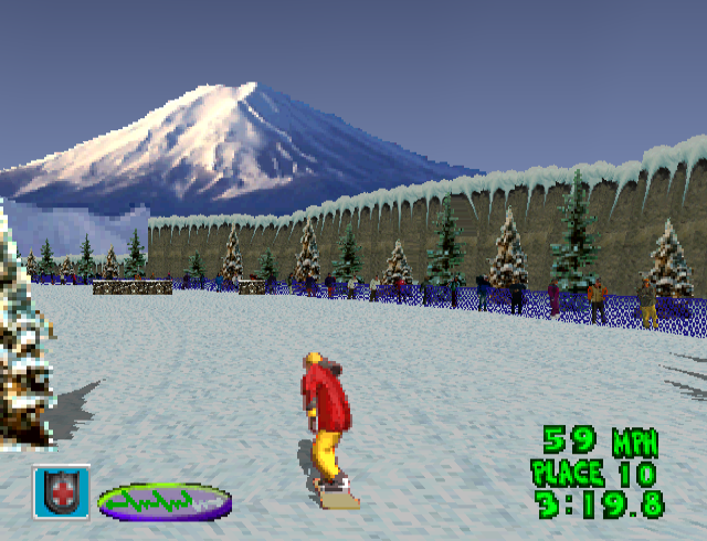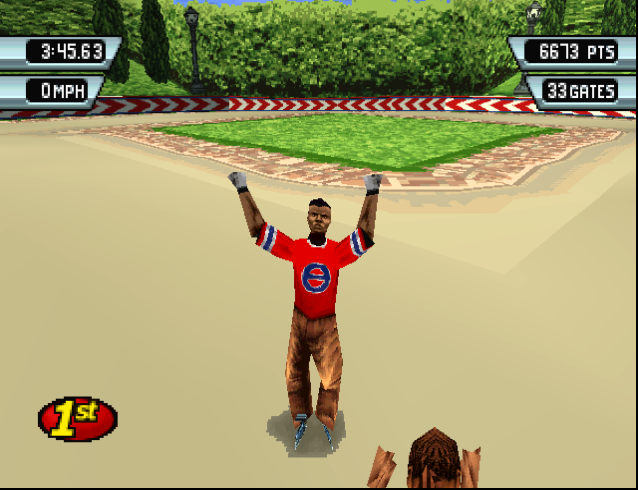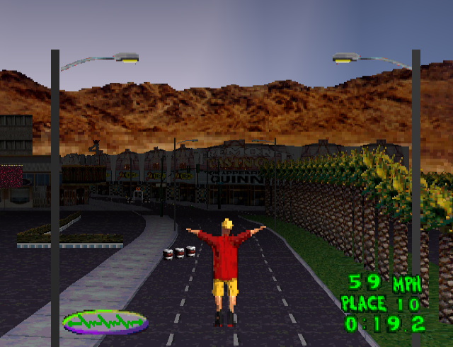 The concept in question here is ‘compete in races on skateboards, mountain bikes, snowboards and roller blades (Remember them?)’. Extreme sports, right? I haven’t played the original game to which this is a sequel, but I imagine it’s not that different. Most objects in the game are 2D sprites, including the player, other racers and obstacles. Such was the way with many games for the Playstation until 1998-ish - either people were still working out that 2D sprites in a 3D environment looked ugly, or developers still hadn’t quite figured out creating fully 3D animated environments. Or both.