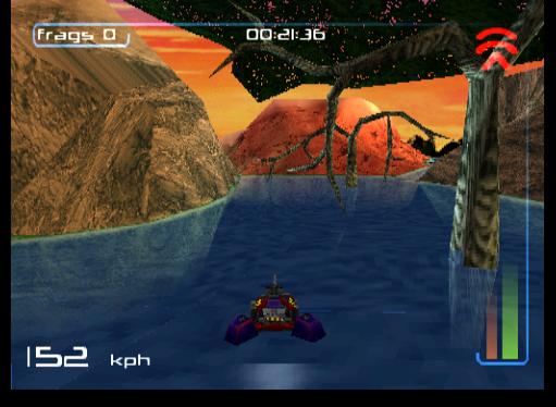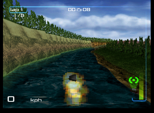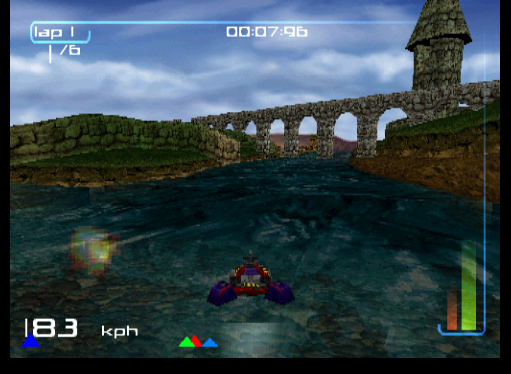 ‘On-water racer’ is a subgenre of racing game you really don’t see anymore, but in the late 90s there were a few of them about (Wave Race and Jet Rider come to mind). It’s a change-up to the traditional ‘stay on track, manage braking and steering’ approach, where rather than the challenge being about handling the forces of friction and mass on your vehicle, you get to grips with handling the lack of both. Wipeout popularised this on the PS1.