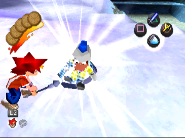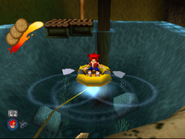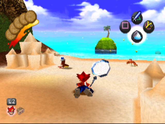 The loop is thus - land in level, track down monkeys, outfox their attempts to flee or fight back or otherwise shake you off their tail, bag them in the net (which is flavoured with a satisfying schwoop sound and miniature light show), and get teleported away once you reach your requisite number of captures. The structure follows a format so familiar to PS1 platformers that I would go as far as calling it a bit lazy - you have a hub level with a save room, which also acts as a level select area allowing you to move on, or return to a previously completed level to capture any monkeys you may have missed the first time around (usually only reachable with a new gadget).