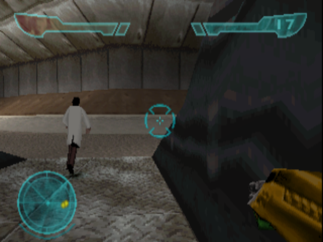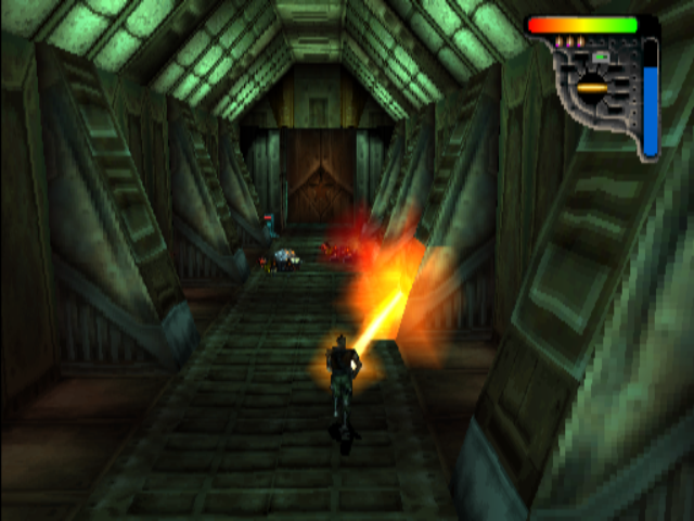 The thing I liked the most was discovering that with a bit of fiddling you can set up to play with the dual-analog FPS control system that everyone is familiar with. The default is the painful directional-buttons-to-move-and-turn-and-shoulder-buttons-to-strafe-and-look setup that still held a firm chokehold on the genre at the time. The dual stick setup is actually pretty smooth and responsive too - it feels better than Alien Resurrection, but still isn’t quite twitchy enough and suffers from the lack of aim assist QOL tweaks that its 21st century descendants worked out - there is an automatic auto-aim, but it takes a bit of luck to get it to trigger, and trigger at the right enemy.
