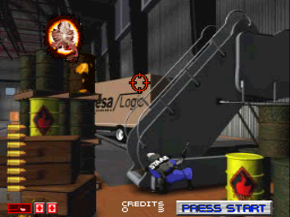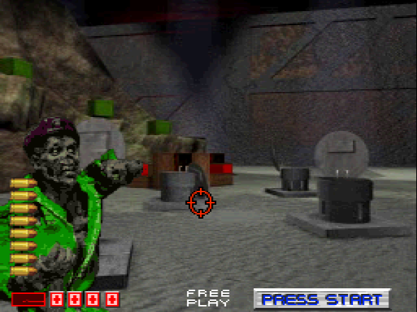 Taking damage seems to be random and based around simply taking too long to shoot back at the zombie goons. The thing is, because you’re basically watching a fixed FMV, the game moves on without you anyway if you take too long, and conversely if you turn the zombie roadmen into giblets too quickly, your viewpoint will just sit there pointing at an empty area until the FMV catches up.