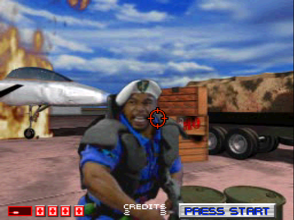 It’s a bit of a poor man’s Virtua Cop. The way the game works is by playing a sequence of 3D rendered FMVs - you can spot the short pauses as one FMV ends and the next one is loaded - to give the impression of action and movement while 2D sprites representing alien enemies dressed in terrible 80s shell suits get pasted over the top, popping up from behind other 2D sprites of barrels, ladders and the like.