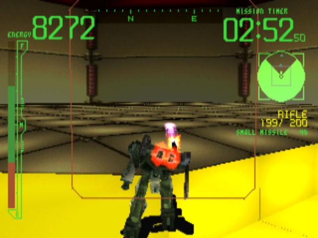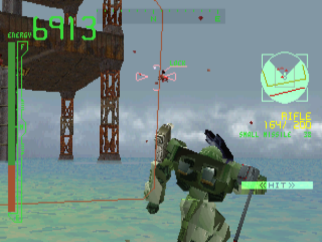 Going in totally blind to Armored Core, the intro FMV seems to indicate that this is a game about giant rollerblading robots. Which is sort of what it is, but it would be unfair to pretend it doesn’t have a lot more depth than that. The root of the game is based around maintaining and upgrading your ‘AC’, meaning you can mix and match segments including your ‘head’, chassis, arms, legs and weapons. You do so by earning cash to buy upgrades through completing missions - taking care not to turn your AC into a wreck in the process as repair costs are deducted in your end-of-mission sum up - and flogging off old gear.