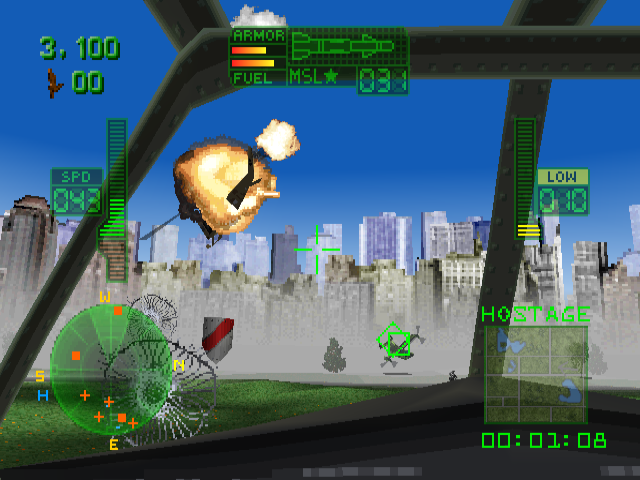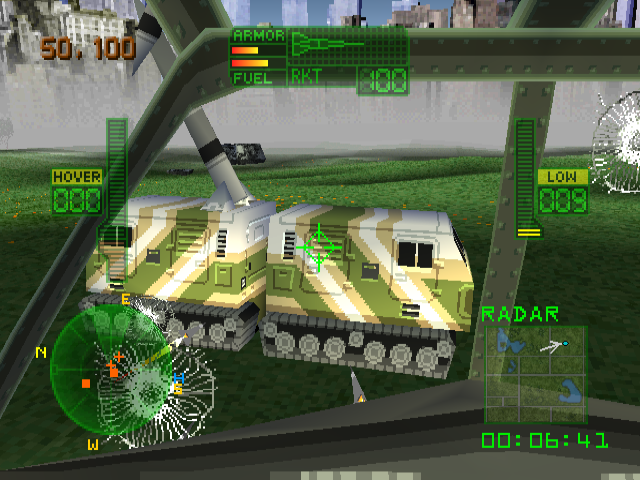 The controls are a bit difficult to work with, and the combination of invincible foliage and the inability to properly change your ‘copter’s height means you spend half your time painfully bouncing off trees. You complete typical go-to-point-B-to-shoot-enemy-C objectives. It’s Army Men Air Attack, but not for kids this time.