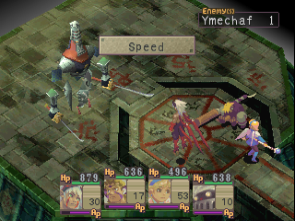 BoF4 is widely viewed as superior to what was in turn viewed as a rather underbaked BoF3, and is talked about as one of the better RPGs on the PlayStation. So it felt strange to feel like I had more fun with BoF3. It could be an expectations thing - in that I went in to BoF3 with none, and into BoF4 with many. But I don’t know. Playing BoF4 is frequently…irritating. The game has evolved the rather rudimentary “isometric but hold down R1 to meekly shift the camera around a few degrees” method of movement from its predecessor into a fully 3D environment which can be rotated around four cardinal directions at will. All it means is you constantly - constantly - get lost behind a wall, or a tree, or some other object and have to spend a few moments faffing with the camera rotation to find which of the four viewpoints lets you see what you’re doing. Take two paces forward, and repeat the process as the cramped environments mean you lose your character again. Doing so also messes with your sense of direction, with the camera always swooping around, and you rely on trial and error until you are able to build up a half-decent mental map of the stage.