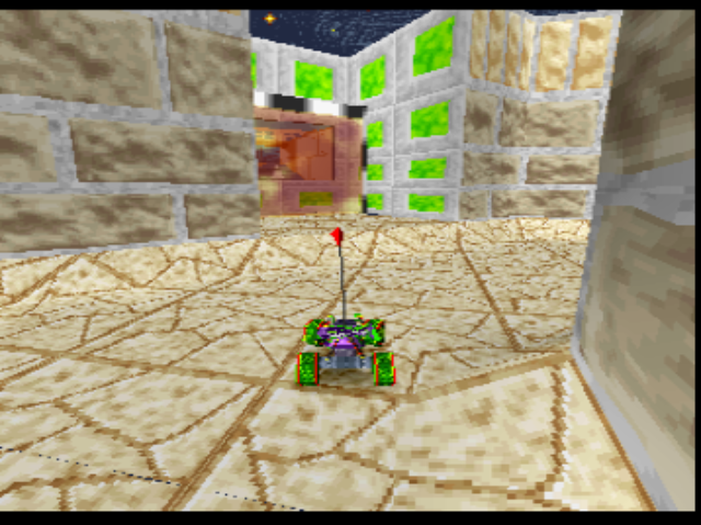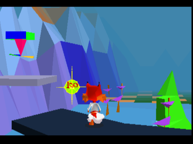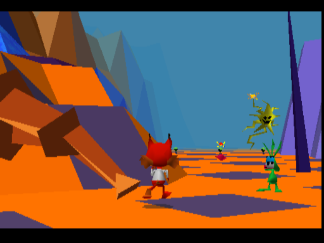 The untextured scenery doesn’t look aggressively ugly so much as it seems excessively garish and bizarre. There are many worse looking games out there. The real war crime is - it’ll shock you - the control system, which fails in every department and renders the game near enough unplayable. You - very slowly - turn in place, then run forward and backward, pressing a face button to jump, at which point the camera goes into a short epileptic seizure. For reasons unknown, when you jump, the camera tries to move into more of a top-down view. When you land, it returns to the floor-level third-person view. Do it in quick succession and chaos reigns. The most inexplicable aspect of the controls is the fact that once you let go of the ‘forward’ button, Bubsy will keep running for a few extra paces to gradually come to a halt. Why would you do this? Sonic played like this too, but in a 2D environment with responsive controls, it worked. In Bubsy, it just means you fall off platforms and die, or run into water and die.