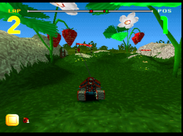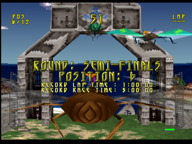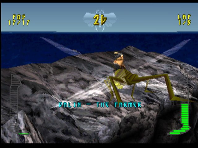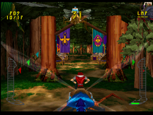 Having to watch the speedo so closely might make you think that you risk losing sight of where you are going, and fly off the track. Not really. You see, the ‘racing’ element of Bug Riders isn’t really racing at all - it has more in common with an on-rails shooter. If you don’t tap a direction, your bug will stick to the course anyway. Your primary concern (aside from thrashing your bug with a riding crop) is manoeuvring up, down and laterally to orient your bug through rings which add short bits of time onto your arcade-racer-esque countdown clock. It’s harder than it looks and if you miss too many in a row, you WILL run out of time and be eliminated from the race. The other thing you need to do is line up your bug so that you can mash the triangle button to fire energy balls and other odd-but-cliche kart racer weapons at your entomological competitors. So there’s a bit going on on screen.