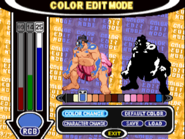 As for the game, it feels like there’s a lot to it. Mostly your expected fighting game fare - bog-standard arcade mode, 2-player, player vs CPU, and a team battle, but there are a few oddities. One is a poorly translated (in fact, the whole game is terribly translated) mode which lets you use accrued points to buy…something or other. I couldn’t work it out. What’s wilder is the ‘paint mode’, where you can fiddle with RGB knobs to change the colour schemes on any of the fighting roster. Weird, and…pretty pointless.