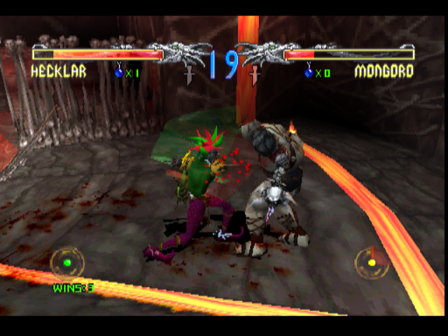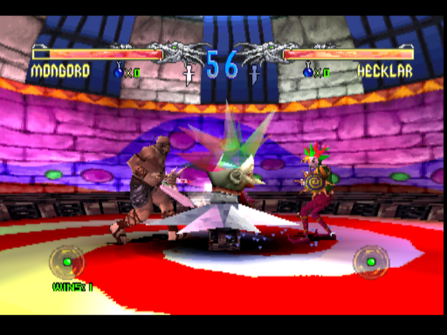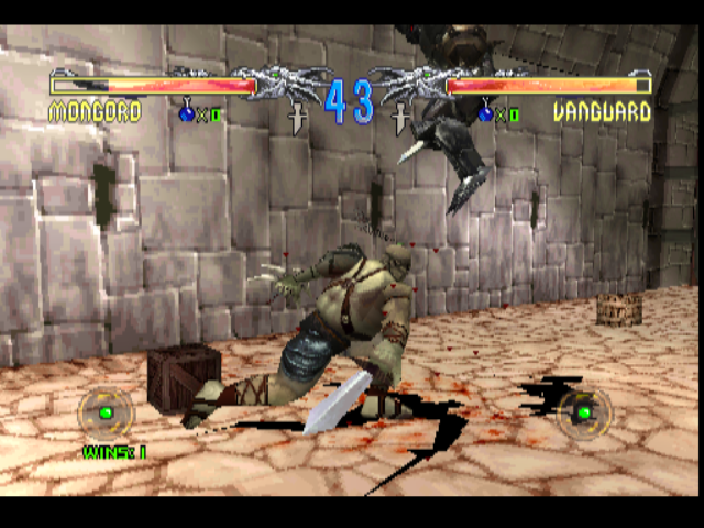 The rather morbid style reminds me a bit of the doomed Thrill Kill. It’s pretty gory by the standards of the time. It does a few things that are a bit different to your garden variety fighting game, though. In particular is the various boxes of items that are scattered around each arena, containing health potions, various buffs, and also a giant, sparkling sword, which once picked up causes your character to start flashing and I have to presume boosts your strength, though to be honest I couldn’t really say for sure what effect there was beyond the lightshow.