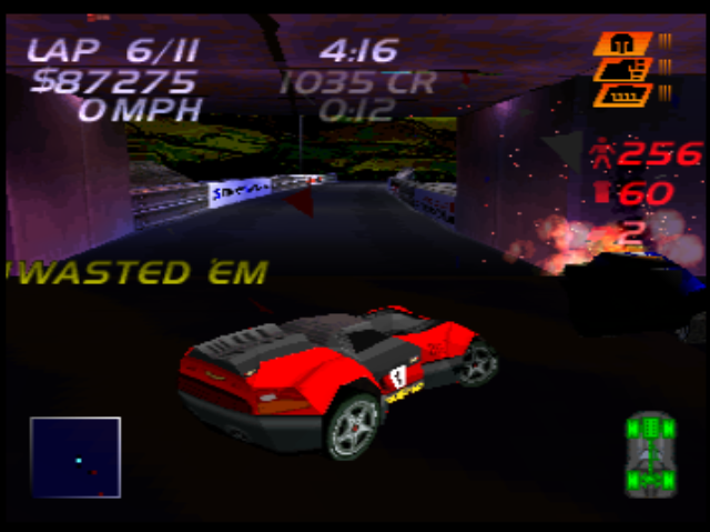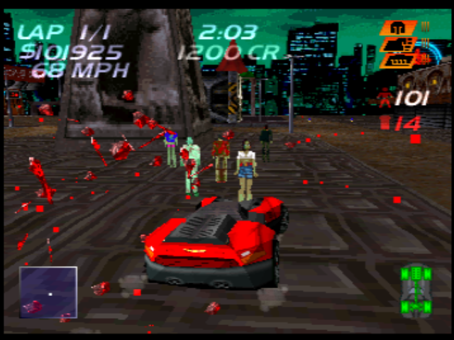 There are a selection of power-ups one can pick up randomly, ranging from the useful (speed boosts, car armour) to the pointless but funny (‘instant handbrake’ and ‘bouncy car’). The most fun one is a power-up which fires electric arcs at any nearby pedestrians and makes them instantly explode in a mess of guts and body parts. You have to embrace the silliness.