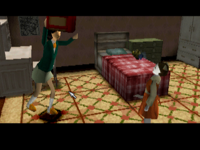 At least, in a manner of speaking. Scissorman can only be temporarily removed from the immediate picture by either finding a hiding place (by rapidly clicking at bits of the environment in a panic) and watching a short scene where he pokes around and then gives up and slopes off, or by engaging in a bit of comedy slapstick to knock him out. This can be done through various stupid means, like hiding behind a cupboard and then whacking him over the head with a frying pan as if you were watching The Flintstones. Japan!
