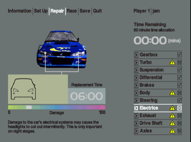 You’d enjoy the experience of the aforementioned vehicular carnage anyway, as it was one of the first games on PlayStation outside of the likes of Destruction Derby and Twisted Metal (where smashing up your car was the whole point) to include halfway realistic damage modelling on your whip. It’s nothing special, but it’s indeed there nonetheless, and damage to your car has a knock-on effect on its handling and engine quality, which gives you something to think about when you get a little bit of time to sellotape things back together between rally stages. This provides the player with an incentive to try not to bash their car into a telegraph pole early on or use cheap videogame tricks like ‘bumping’ your car around corners at speed. Take out your front headlights on a night stage and it’s more or less game over.