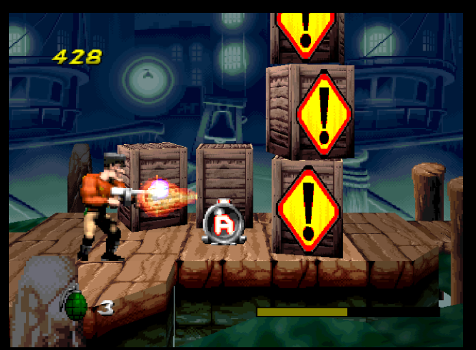 What we have here is a semi-3D Streets of Rage-meets-Metal Slug where as the titular Agent you move from left to right, gunning down goons, throwing bombs and picking up gun powerups. The difference being that in this new era of three dimensions, you can move a few yards toward or away from the camera in the process - but not that much. Most objects are 2D sprites, and trying to shoot enemies not quite on your z-axis is tricky. There are also some ludicrous platforming sections where you have to land yourself across-axis onto small positions over water, which just doesn’t work. The developers knew this it seems, as dunking into the drink simply respawns you back on the edge - no lives lost; you don’t even take damage.