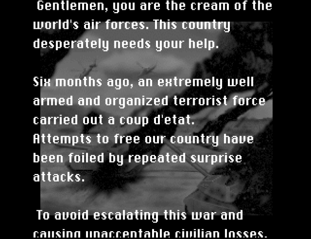 The game has more in common with Ace Combat 2 than 3, which in releases outside of Japan accidentally binned off the Top Gun-esque narrative elements which the series was all about. That’s not to say the yarn the original does weave makes any sense. A ‘terrorist group’…with an air force? At least some effort is made to paint the motives of the pilots within the jets you’re blowing up as ill-intentioned and dangerous, as opposed to Ace Combat 2 which disconcertingly has them described as no more than ‘the enemy’ as you carpet bomb civilian areas.